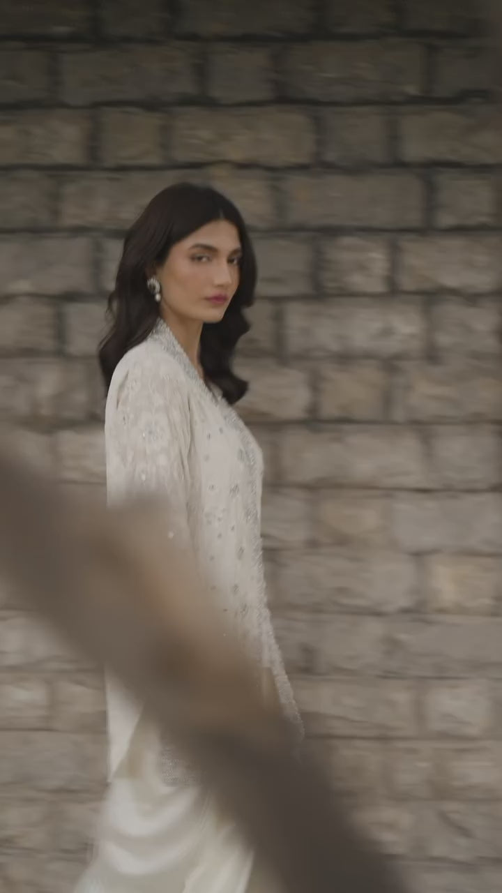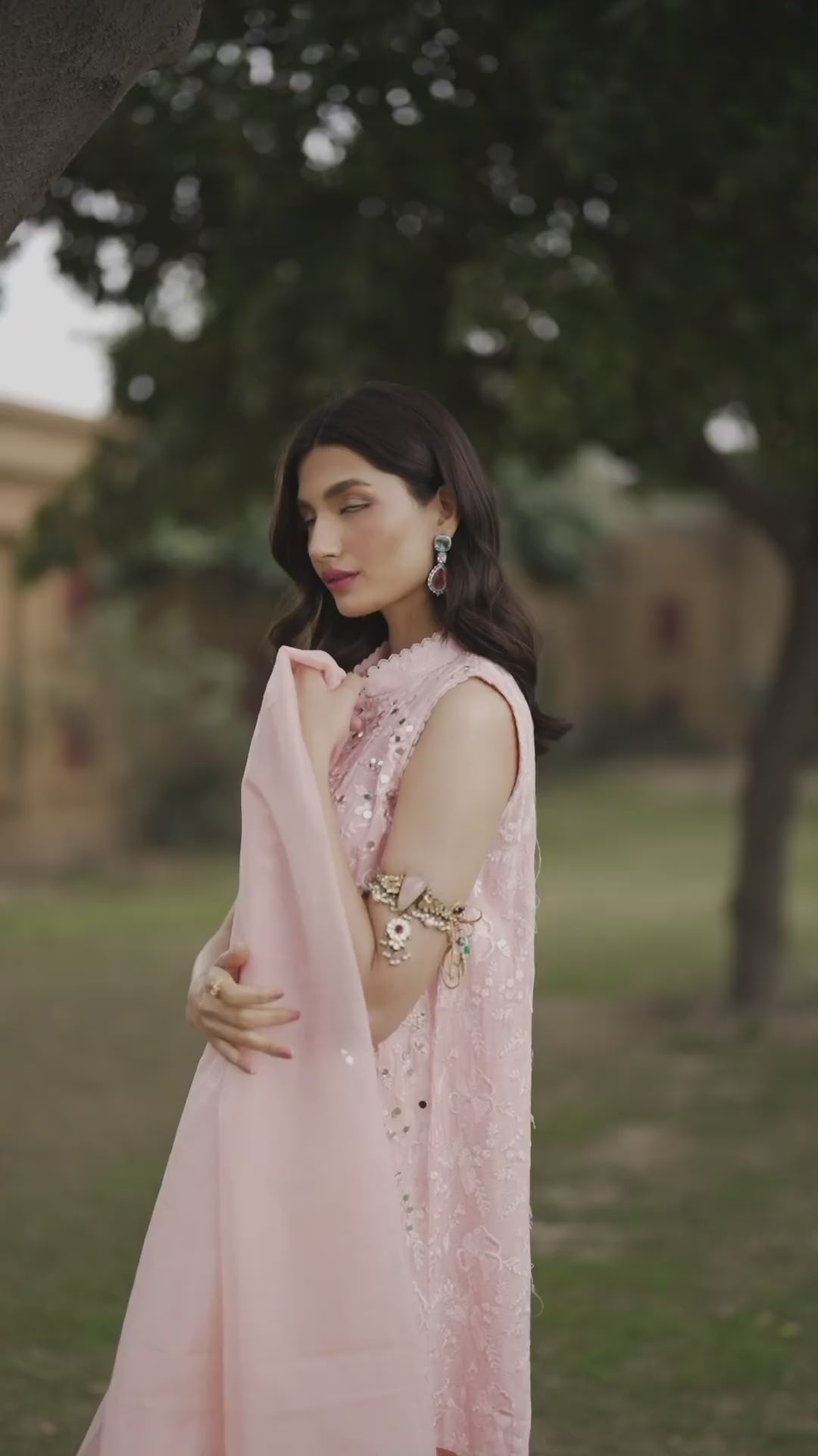 This blush-toned ensemble features a sleeveless cotton net shirt embellished with delicate mirror embroidery, reflecting light with every movement. The look is completed with soft viscose pants cut in an asymmetrical drape, and an airy organza dupatta finished with traditional gota work