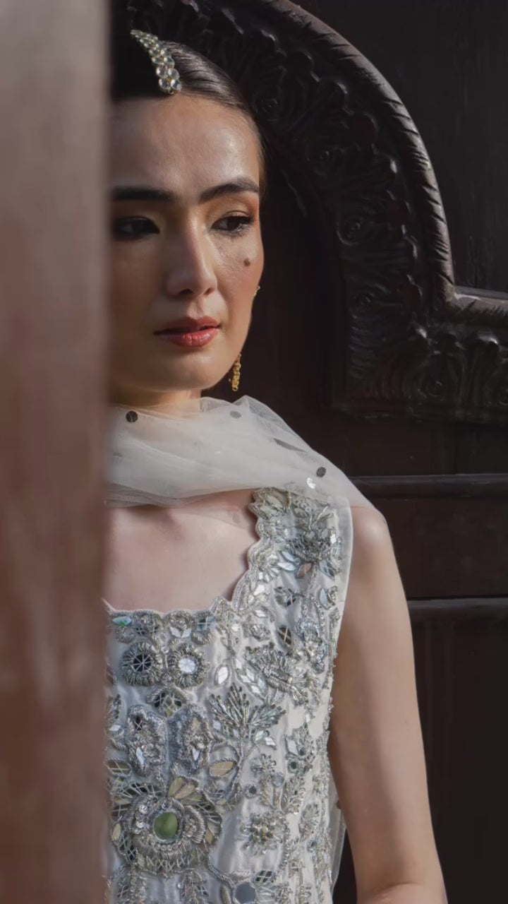 The ensemble is completed with a light chiffon dupatta, detailed with fine mukesh work for a soft, luminous sheen.