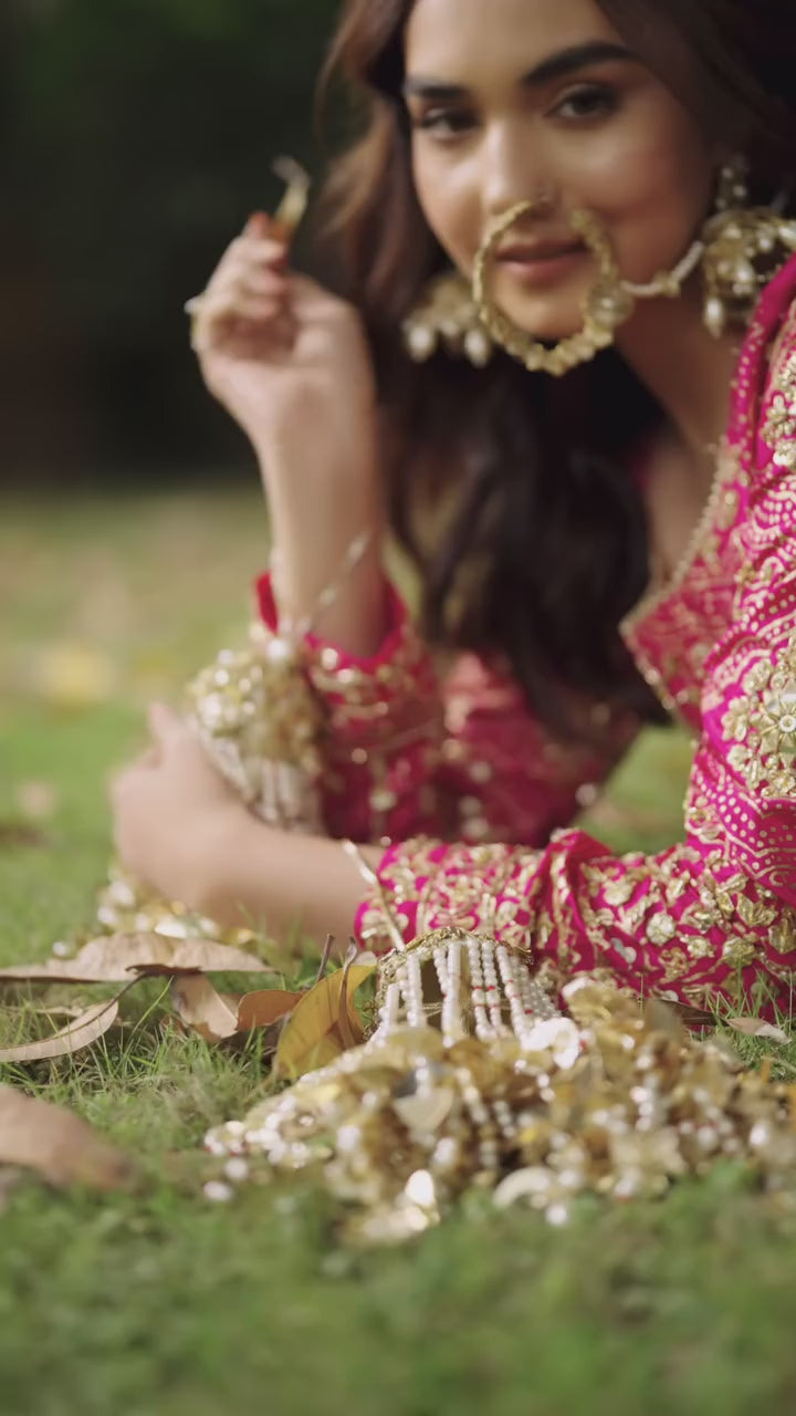out your traditional side in our pink raw silk shalwar kurta with block printing patterns, handwork of jewel motifs and gota, sheesha work to its finest.